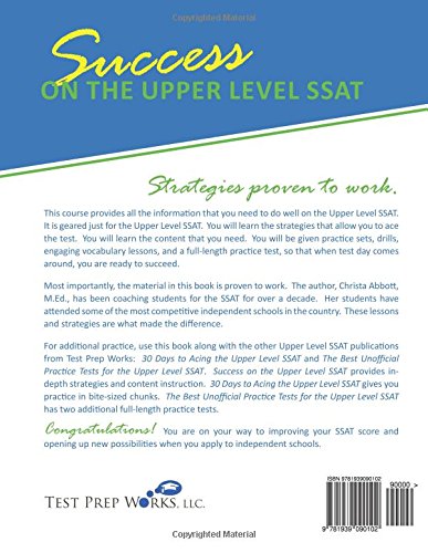 Description : Success on the Upper Level SSAT: A Complete Course is a complete course to prepare for the Upper Level SSAT, and this second edition has been updated for 2014. This book provides the comprehensive test-taking strategies and content that students need to ace the test, including: Vocabulary lessons that ask students to categorize words and derive meanings from roots so that they can handle anything on test day Math content lessons that explain the concepts and how they will be applied Detailed strategies and drills for the reading section NEW FOR 2014 -- One full-length practice test to prepare students for test day UPDATED FOR 2014 -- New and expanded topics in the math content lessons reflecting the most recent published changes to the official guide from the SSATB This book is designed both for students and families to use independently and for educators to use as a text with their students. While most other prep manuals mix together instruction for very different tests into one single volume, all of the material in "Success on the Upper Level SSAT: A Complete Course" is specific to the Upper Level SSAT. Students can use this book confidently and independently without being distracted by material that is not relevant. Test Prep Works has developed a series of books specifically for the Upper Level SSAT, including: Success on the Upper Level SSAT: A Complete Course -- Students benefit from the comprehensive content instruction, test-taking strategies, and practice provided in this book, including vocabulary lessons and drills, math content lessons and problem sets, reading strategies and drills, and one full-length practice test. 30 Days to Acing the Upper Level SSAT -- Students looking for more practice will benefit from the 15 "workouts" in this book, and instructors can use the workouts as assignments that reinforce test-taking strategies and help measure progress. Each workout includes practice questions from all sections of the test and can easily be complete
